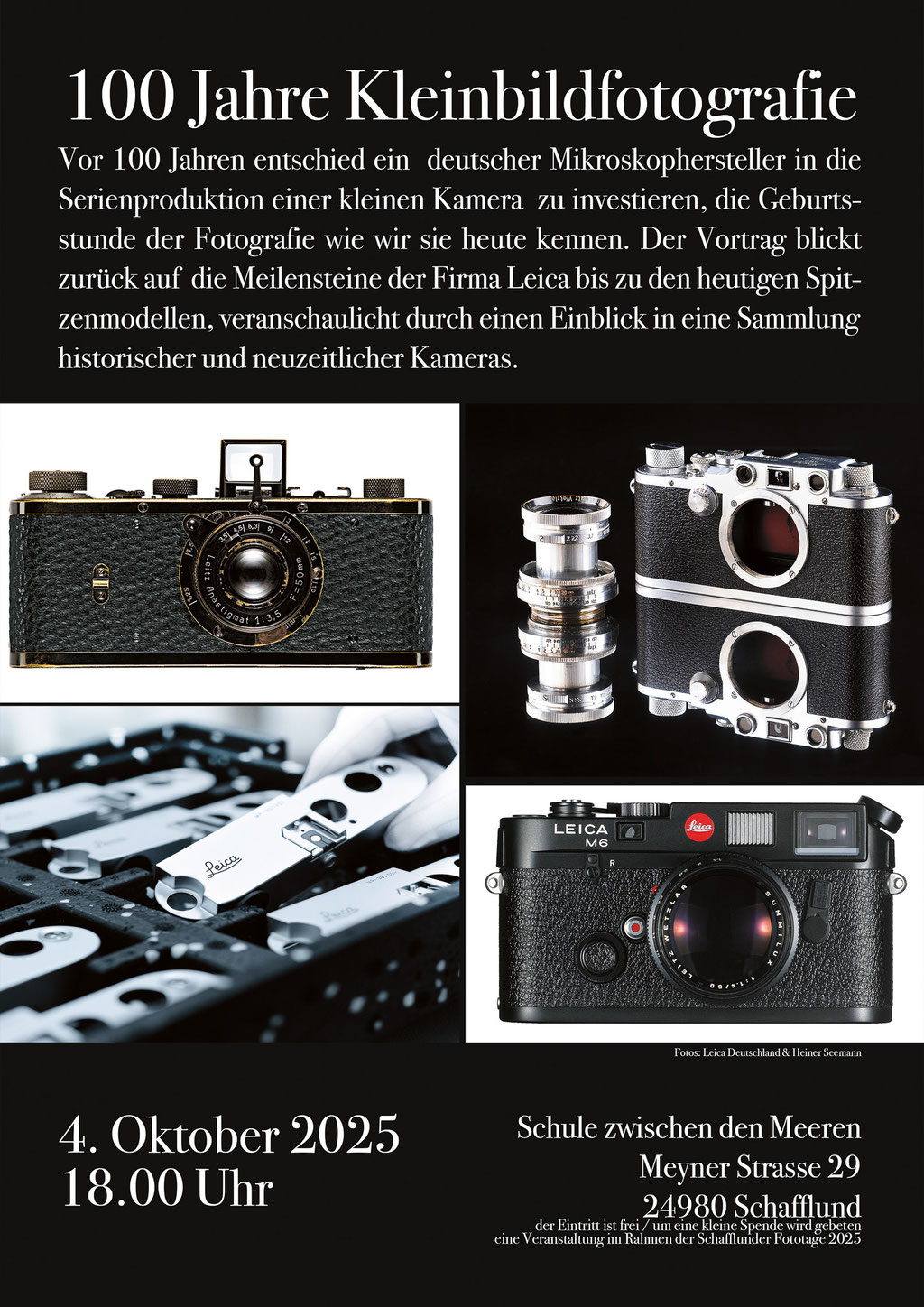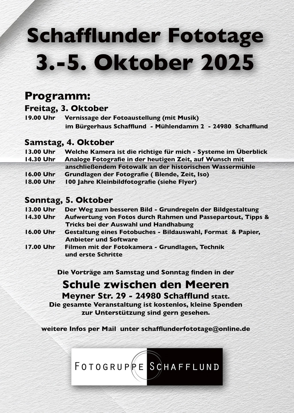 Die Fotogruppe Schafflund veranstaltet zum ersten Mal die Schafflunder Fototage, und zwar vom 3. bis zum 5. Oktober. Zur Eröffnung findet am 3. Oktober um 19 Uhr eine öffentliche Vernissage der Fotoausstellung im Bürgerhaus Schafflund statt. Rund 80 Bilder werden zu sehen sein. Die Ausstellung ist auf den folgenden zwei Tagen von 11 bis 18 Uhr geöffnet. Außerdem stehen in der Schule zwischen den Meeren interessante Vorträge auf dem Programm – thematisch vielseitig und auch für Einsteiger lohnenswert. Höhepunkte dürfte dabei ein Vortrag über 100 Jahre Kleinbildfotografie mit Einblick in die Sammlung historischer und neuzeitlicher Kameras eines großen, deutschen Herstellers sein. Der Sonntag bringt einen Vortrag über analoge Fotografie in der Neuzeit – mit anschließendem Foto-Walk zur historischen Wassermühle aus dem 14. Jahrhundert.